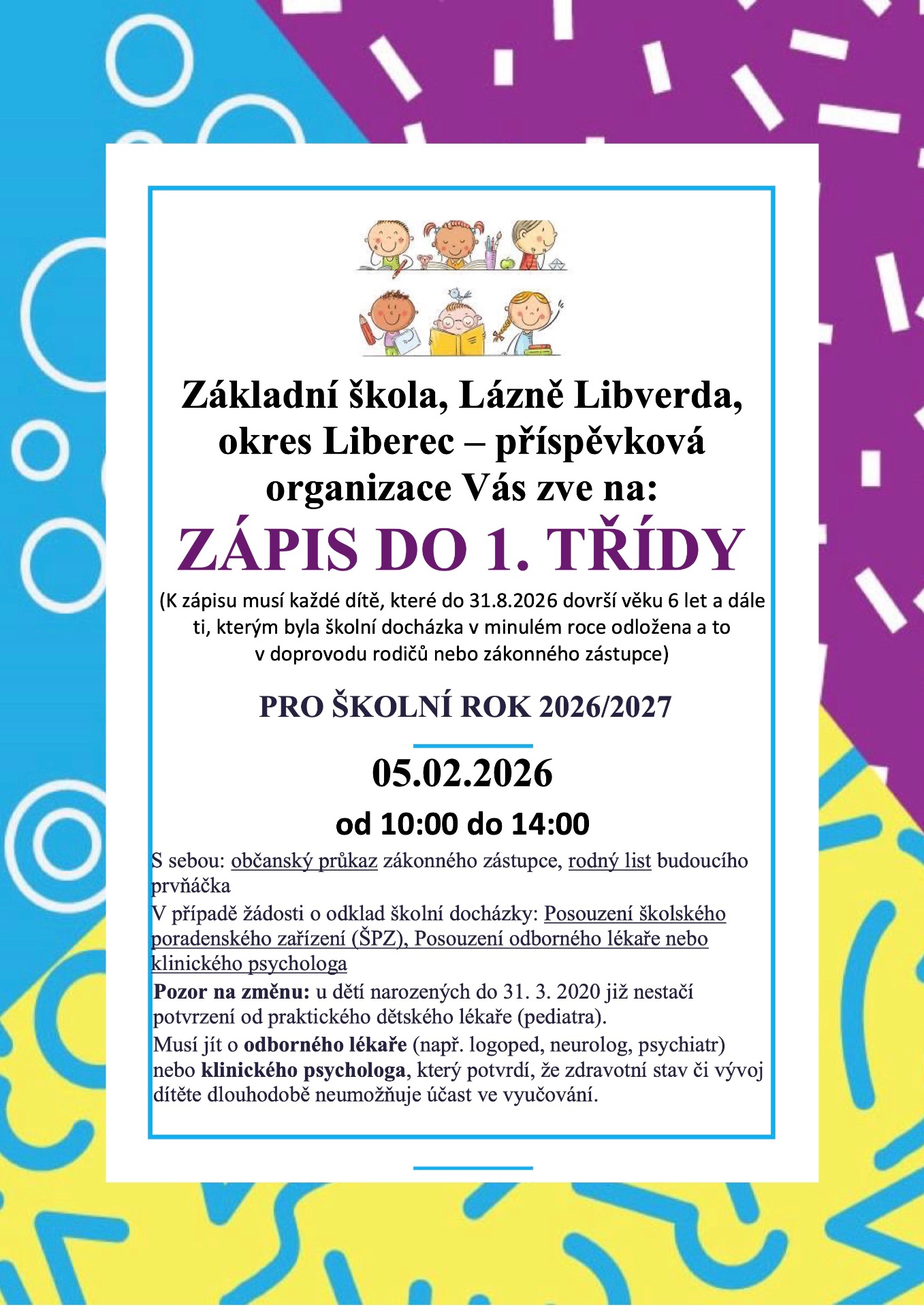 Zápis se týká každého dítěte, které do 31.8.2026 dovrší věku 6 let a dále těch, kterým byla školní docházka v minulém roce odložena. Budoucí prvňáčci přijdou a v doprovodu rodičů nebo zákonného zástupce.